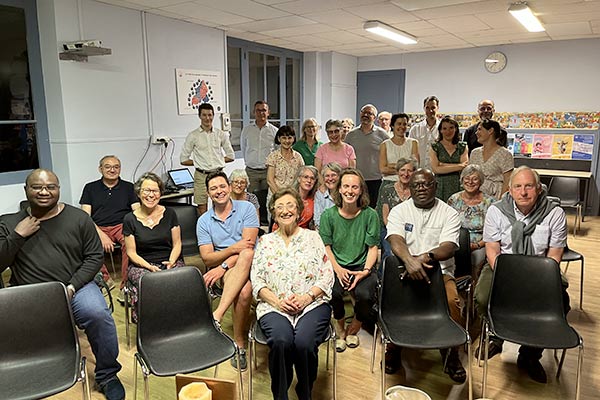 « L’idée d’inviter nos voisins de bancs d’église nous a tout de suite plu ! C’est avec plaisir que nous avons accueilli Jean, Suzanne et Noémie et nos enfants pour un bon repas dans notre jardin, au milieu des roses, pivoines et iris. Les échanges furent remplis de bonne humeur et de sujets divers sur nos expériences de vie. Au final, beaucoup de points communs entre les voyages à l’étrangers nos très grandes familles, le goût du vin blanc !!! St Christophe, patron des voyageurs, était notre saint pour la journée. On s’est quitté en se disant que l’expérience était à refaire ! Bravo pour cette belle initiative »